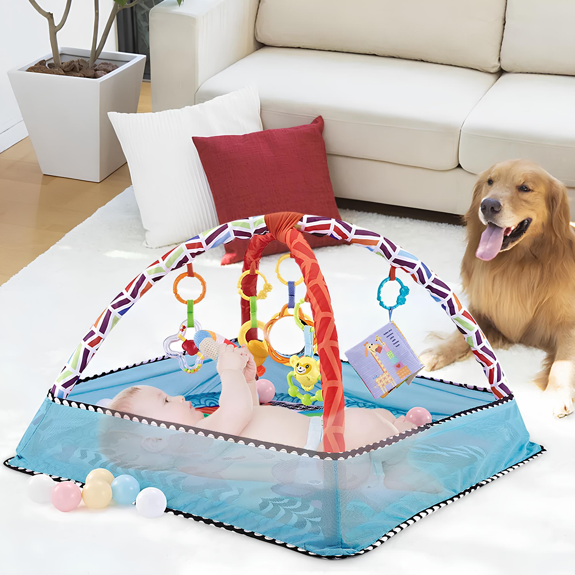 O Tapete Interativo Para Atividades Infantis Com Piscina de Bolinhas da Snel Home é ideal para atividades para bebês. O Tapete Interativo Com Piscina de Bolinhas apresenta uma estrutura colorida e acolchoada com diversas atividades sensoriais para estimular o desenvolvimento do bebê. Possui arcos coloridos que se cruzam no topo, de onde pendem diversos brinquedos interativos, como chocalhos, espelhos e mordedores. A base do Tapete Interativo é macia e estampada com figuras coloridas que capturam a atenção do bebê.